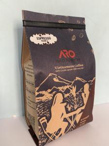 Bao bì: giấy kraft tráng nhôm mặt trong, nẹp miệng túi, sử dụng van thông hơi một chiều theo tiêu chuẩn Châu Âu, nhằm bảo quản chất lượng tốt nhất cho hạt cà phê.